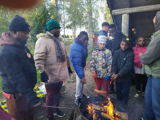 Laavuretkeily jatkui Lempäälässä pakolaisten kanssa. Sään viilennyttyä tarvittiin jo lainavaatteitakin. Tulet tuntuivat kuitenkin kotoisalta.