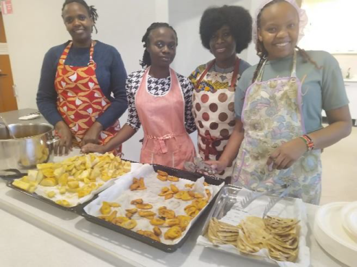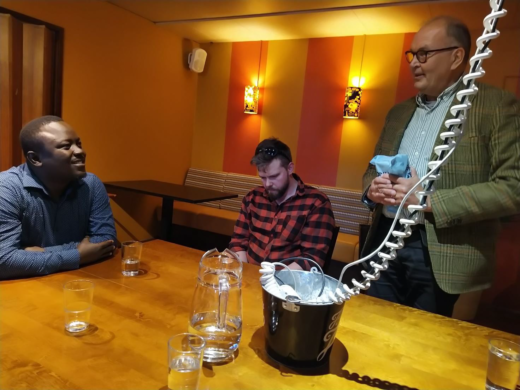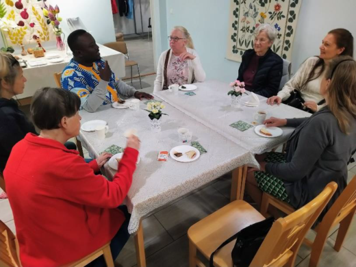 Kokouksen jälkeen kahvin ja karjalanpiirakoiden lomassa Jinnah ja Sierra Leonen sairaanhoitajalähetti Helene Kalmari (Wallin) saivat jakaa ajatuksia entisestä ja nykyisestä Mambolosta ja Sierra Leonesta.